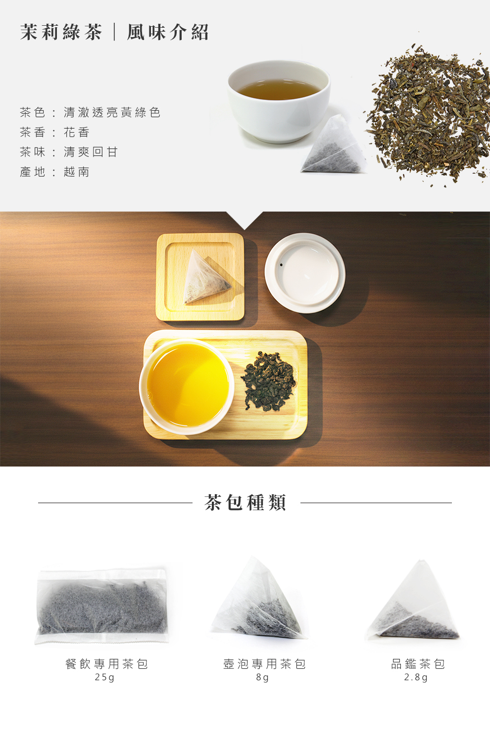 ●帶有茉莉花的清香與綠茶的甘潤,口感滑順。